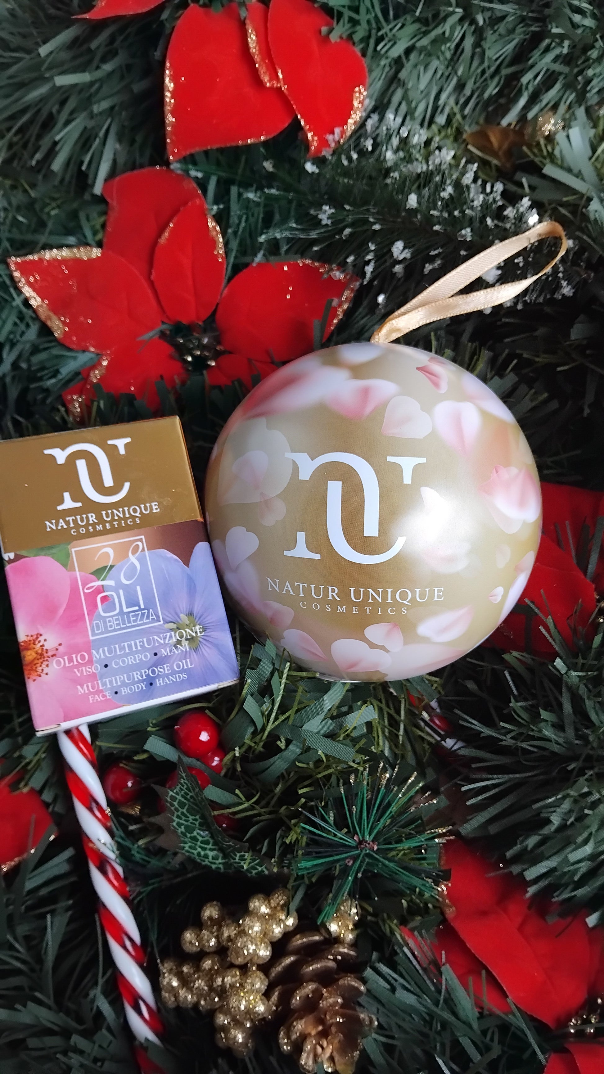 La sfera di natale da appendere all'albero contiene il formato da viaggio del famosissimo olio multifunzionale secco della linea 28 oli da 30 ml