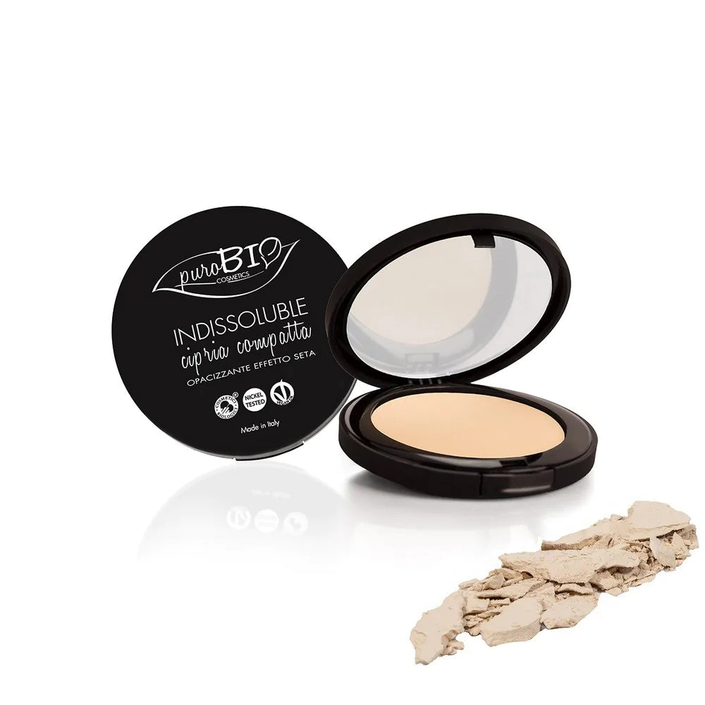 Prelevare un po’ di cipria con il pennello n. 01, applicare prima nelle zone che tendono a lucidarsi e poi procedere sul resto del viso.