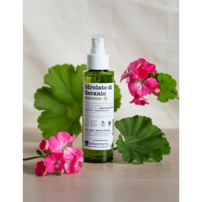L'idrolato di geranio, ottenuto dalla distillazione dei fiori, è una preziosa acqua floreale ricca di principi attivi.